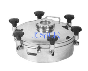 带视镜圆形外开压力人孔盖材质: 304 316L 规格: DN350 - DN600 大小、高度、壁厚、压力均可根据客户要求定做。结构形式: 带合页、带视镜、外开式人孔盖子、手轮式手柄(塑料或不锈钢)。产品应用: 酿酒、乳品、饮料、食品、制药、水处理、化工、化妆品、生物工程、流体机械设备制造等工业领域罐设备上。